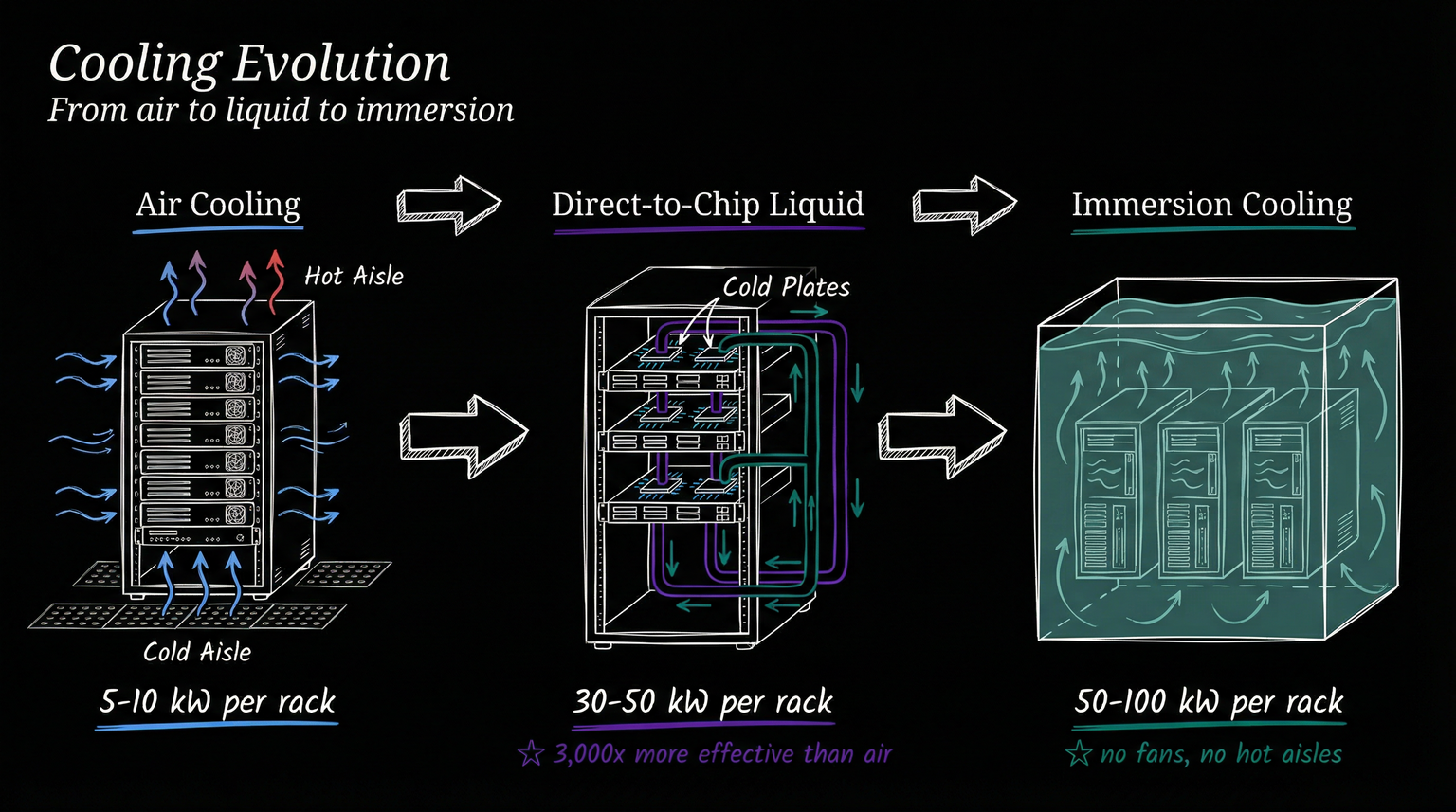 This works fine for traditional workloads at 5 to 10 kilowatts per rack. But AI servers packed with GPUs pull 30 to 100 kilowatts per rack. Air cannot remove heat fast enough at those densities.