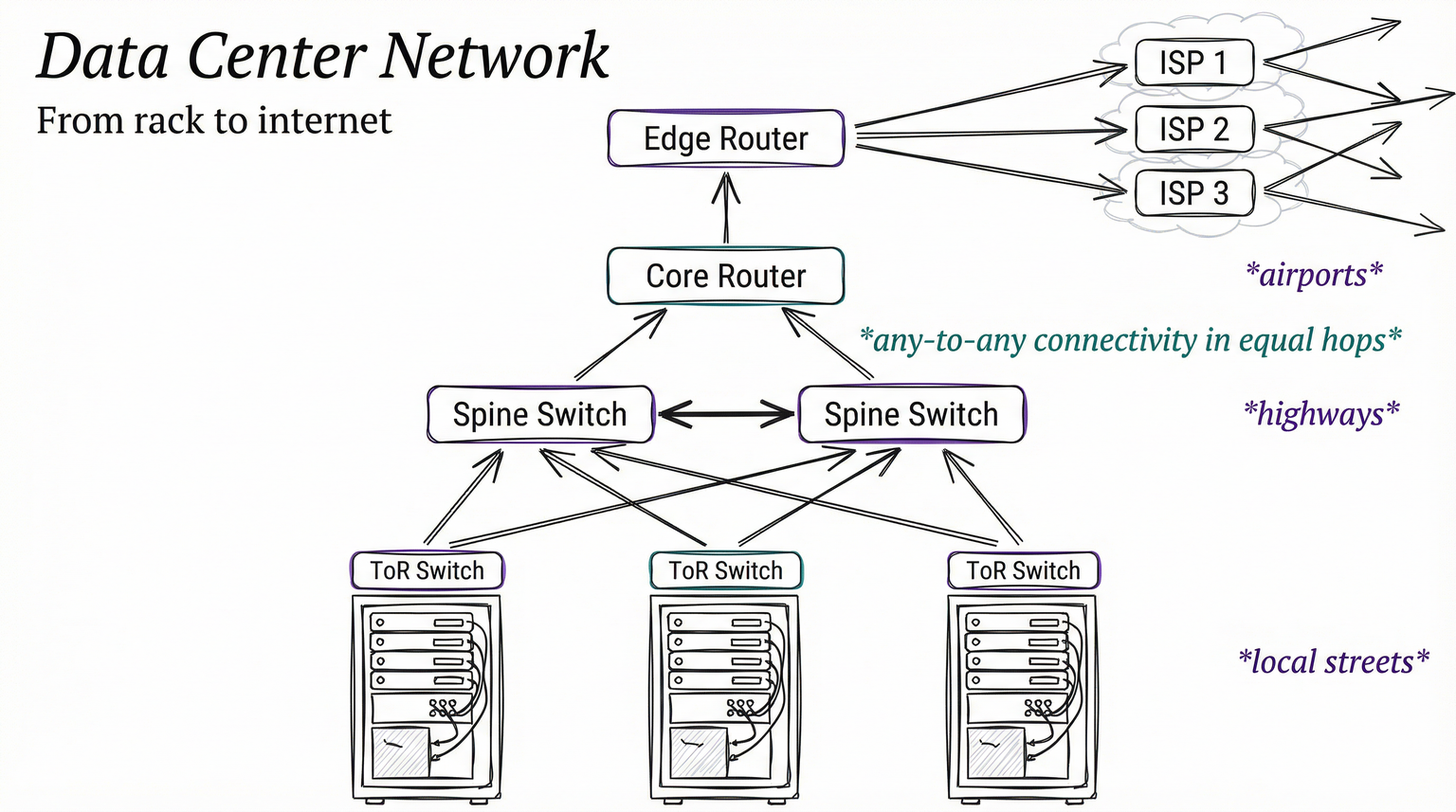 Think of it like a city’s transportation system. Local streets connect houses to arterial roads. Arterial roads connect to highways. In a data center, rack switches are local streets, spine switches are highways, and edge routers are the airports connecting to the wider internet.